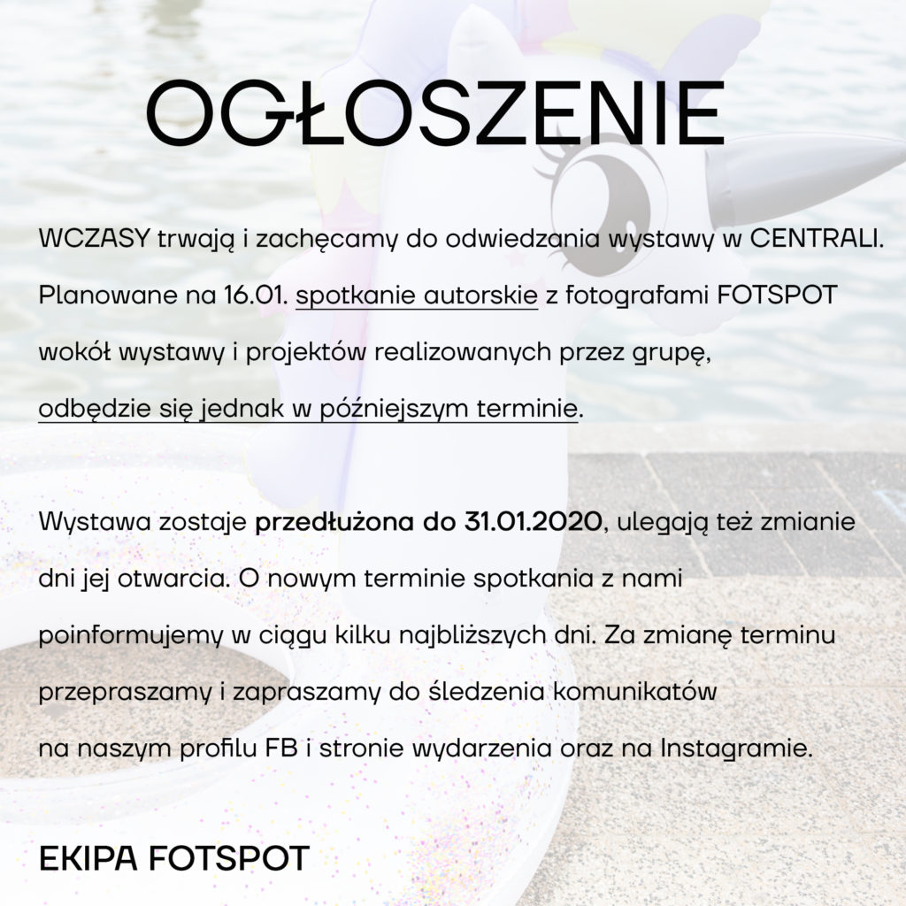 Planowane na 16.01 spotkanie autorskie z członkami FOTSPOT musimy przełożyć, na inny termin, postanowiliśmy też przedłużyć wystawę do końca stycznia i zmienić nieco dni i godziny jej otwarcia.