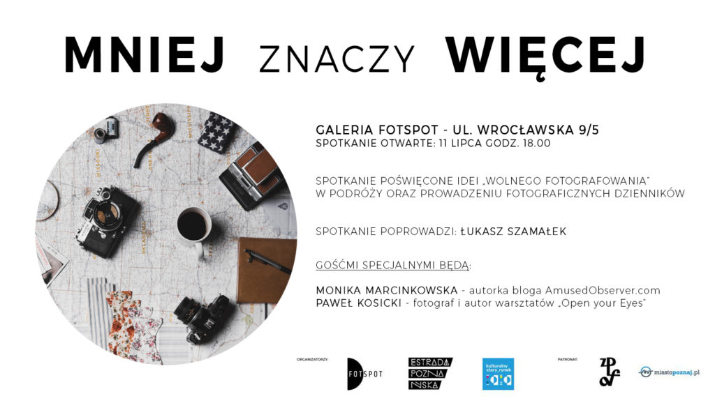 Stowarzyszenie FOTSPOT ma przyjemność zaprosić do udziału w spotkaniu poświęconemu idei „wolnego fotografowania” 11 Lipca godz. 18.00 w tymczasowej Galerii FOTSPOT przy ul. Wrocławskiej 9/5 ( II piętro) w Poznaniu. Łukasz Szamałek wraz z gośćmi opowiedzą o wykorzystaniu fotografii we własnych podróżach i podzielą się radami na temat używania fotografii w drodze. Opowiedzą m.in o:…